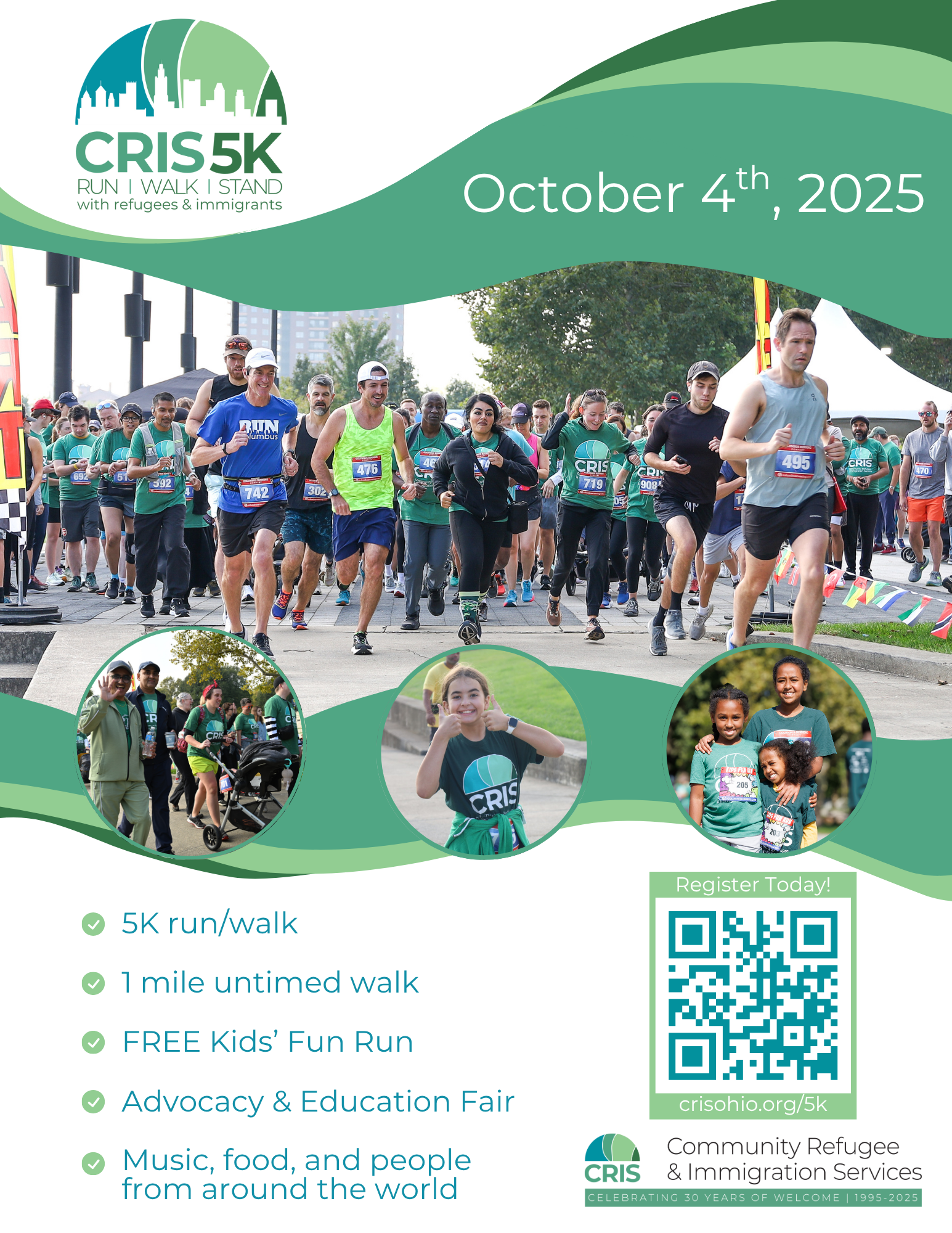 Now in its twelfth year, the CRIS 5K & Advocacy Fair is our largest annual event, bringing together hundreds of Central Ohioans in support of refugees and immigrants in our community. Whether you’re a runner, walker, or a friend of CRIS, we would love for you to join us in downtown Columbus at Genoa Park on Saturday, October 4th, 2025, for a morning of fitness, food, and fun.